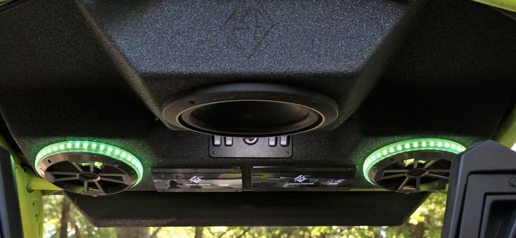 You have one of the baddest side x side's available...now get the baddest sound system designed specifically for it! Check out our AudioFormz roof top stereo system designed exclusively for the Can Am Commander and Maverick! Manufactured from solid hand laid fiberglass, it is one of the lightest, loudest, and strongest stereo tops on the market today! And thanks to our ultra aggressive molded design, it has the looks to back it all up! But we don't stop there. We offer endless options to truly customize your stereo top! Like it real loud?? Then upgrade to our larger 8" EVO2 speakers or add a subwoofer if you dare! Want it even louder?? Upgrade to our 8" Carbon Fiber EVOPRO2 speakers for an additional 3 to 4 db gain! Want it even LOUDER?? Add our ultra efficient, high power flush mount digital amps! Color options...not a problem! Need more lighting?? We offer numerous front, dome and rear LED lighting packages using our proprietary flush mount, ultra efficient LED lights! And if that isn't enough, our top installs in 30 minutes or less with the supplied mounting hardware and a simple two wire hookup! This is your stereo top...build it like you want it and remember nothing performs like AudioFormz!