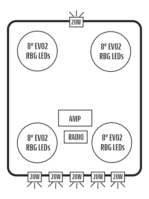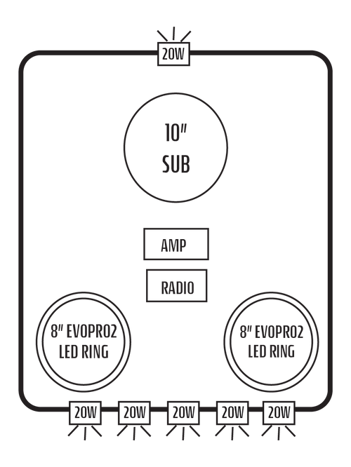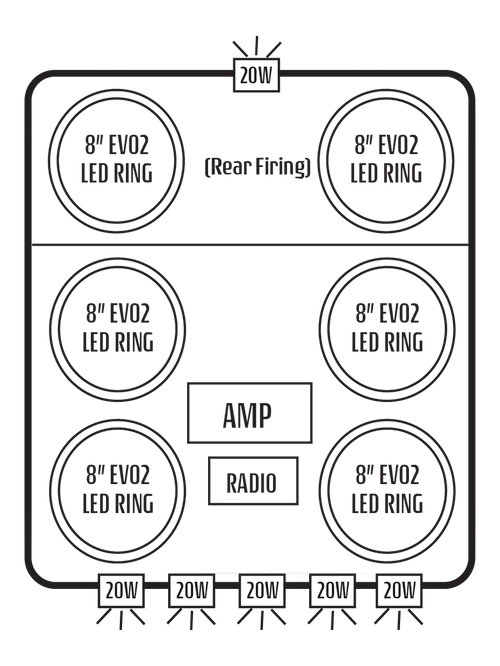 - TWO REAR-FIRING AUDIOFORMZ EVO2 8" IC-LED SPEAKERS WITH IC-LED SPEAKER RINGS