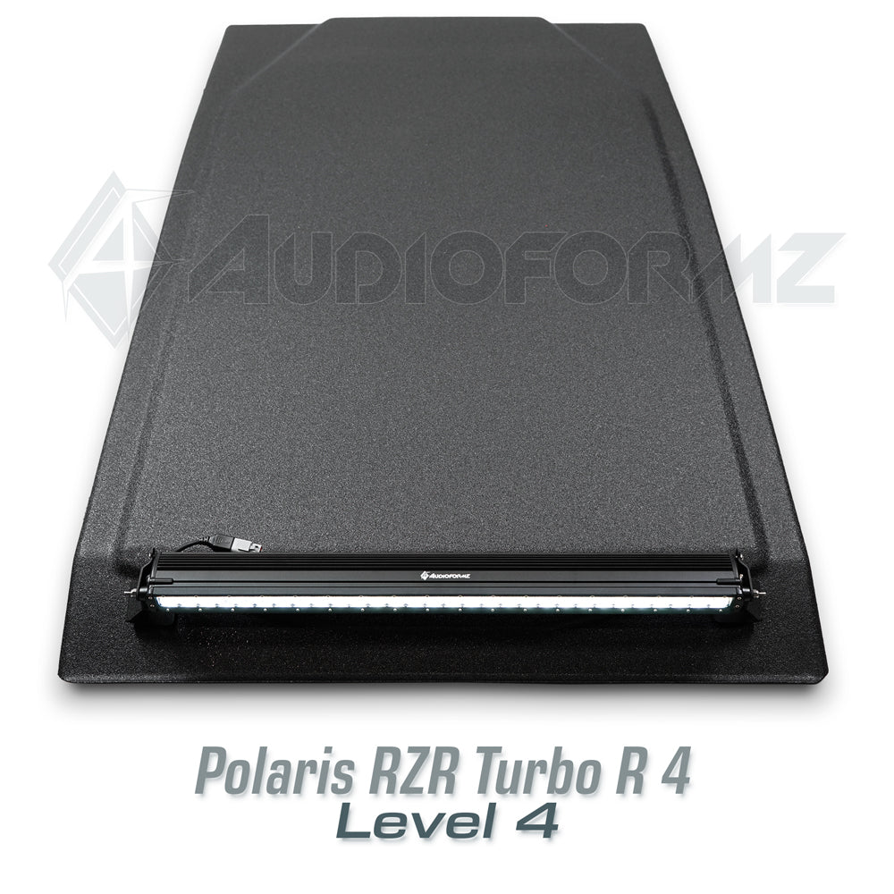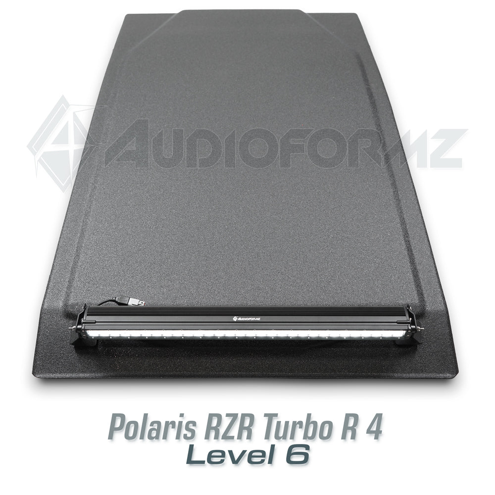 Step up your game with AudioFormz's elite stereo top, crafted specifically for the new RZR Turbo R 4-seat machines. Matching the unparalleled speed and aesthetics of Polaris's finest, this stereo top is not just an addition, but a transformation. Made from hand-laid fiberglass, it ranks as one of the lightest, loudest, and strongest on the market, offering an unrivaled audio experience.
