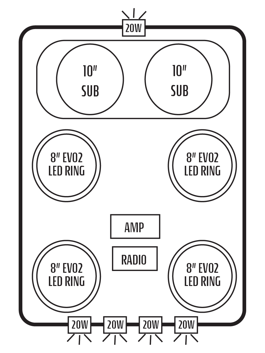 - Customizable Audio Options: Three levels of high-performance speakers and radios to choose from and multiple amplifier options as well as the ability to add up to four 10” subwoofers for a heart-thumping experience