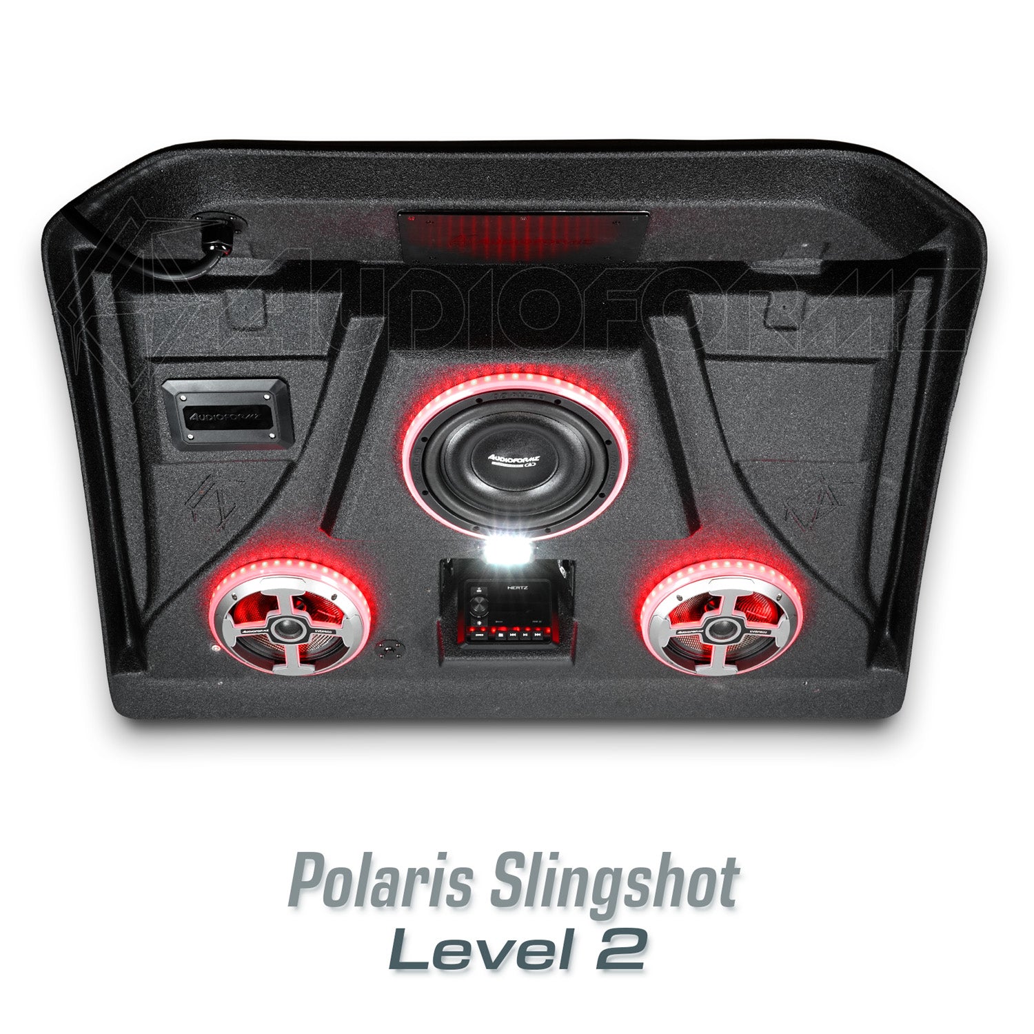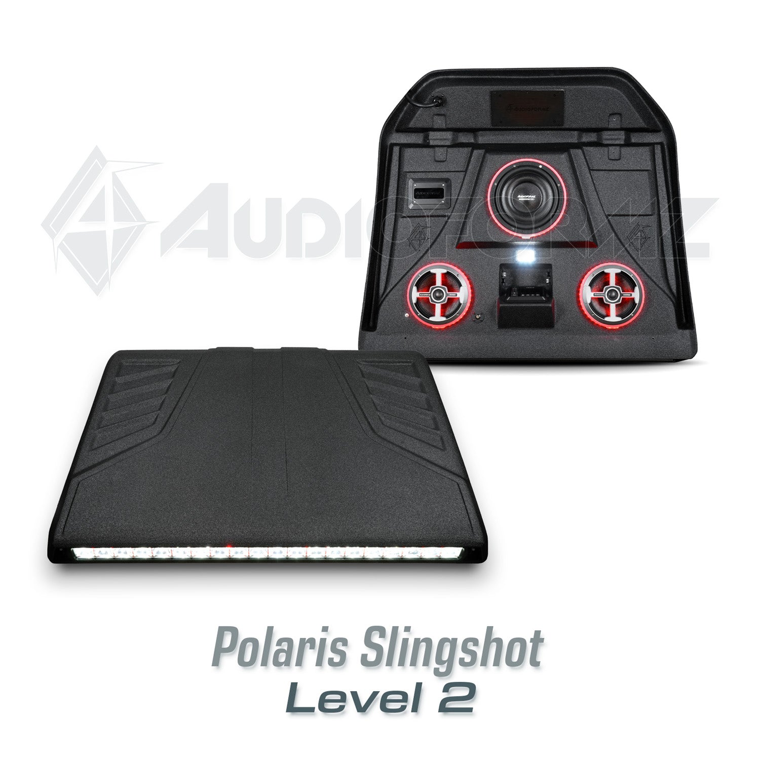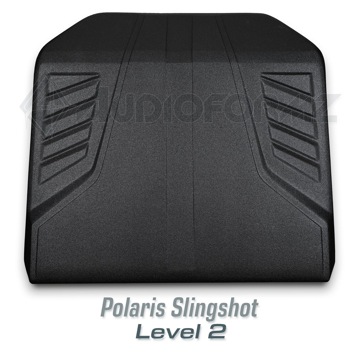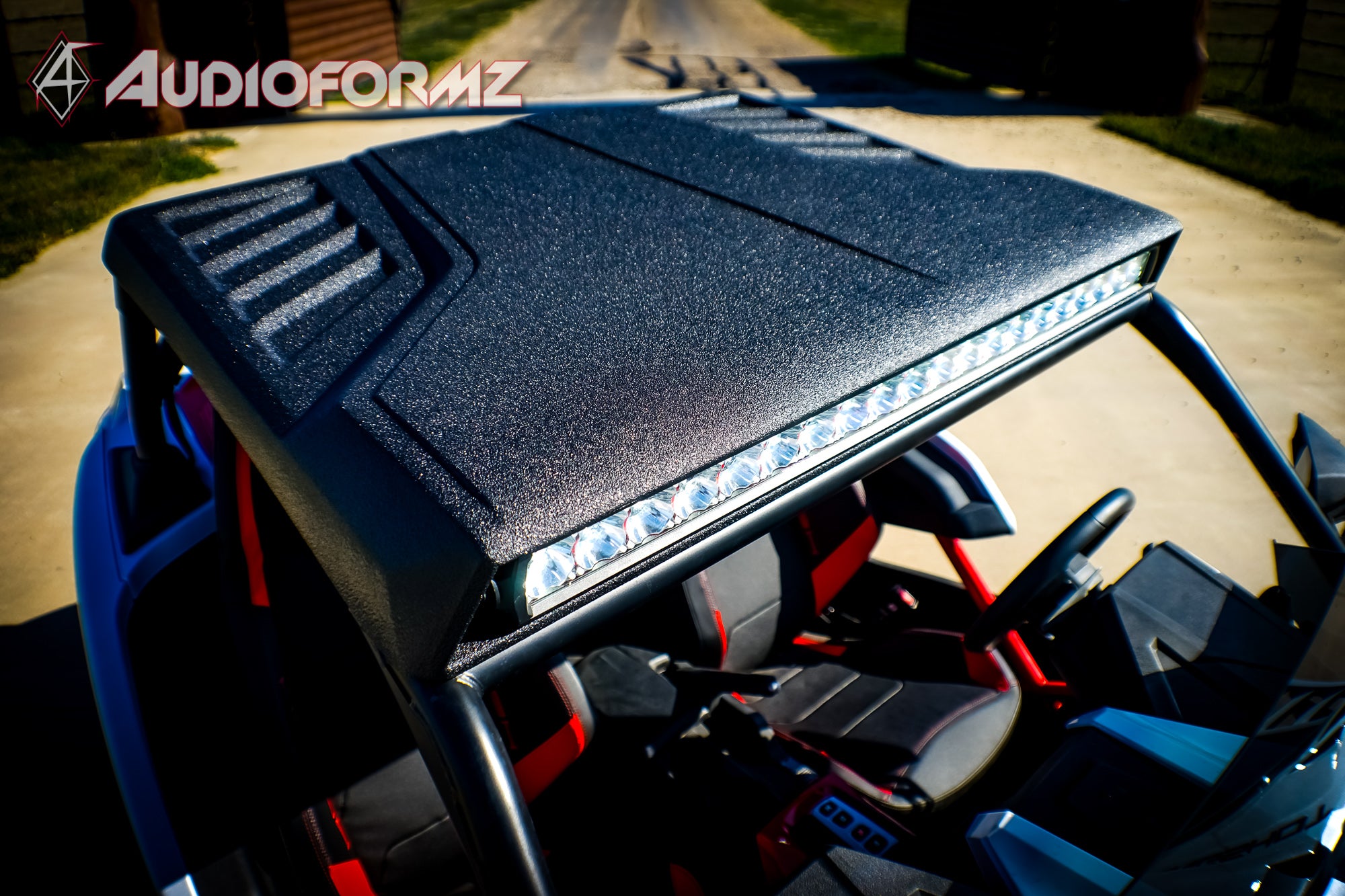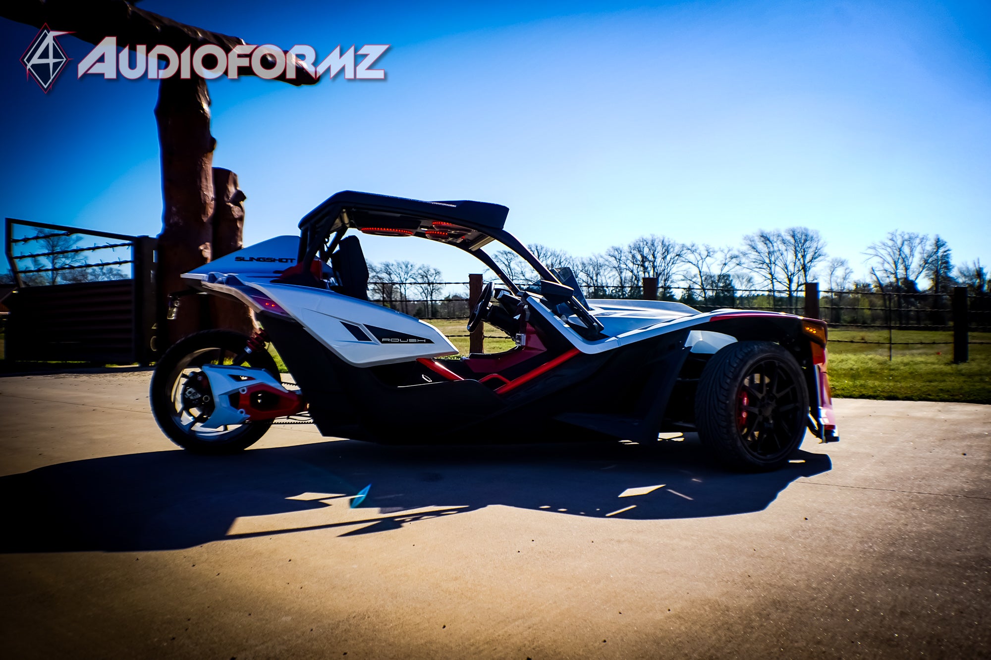 Built to fit Polaris Slingshot models equipped with the optional Polaris Excursion Top Frame OEM roll cage (as shown in photos), this all-new AudioFormz roof system brings killer looks, insane sound, and plug-and-play simplicity to your ride.