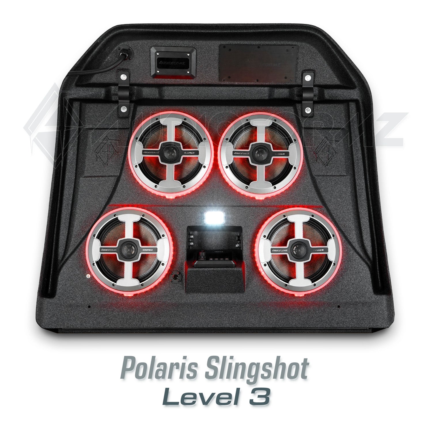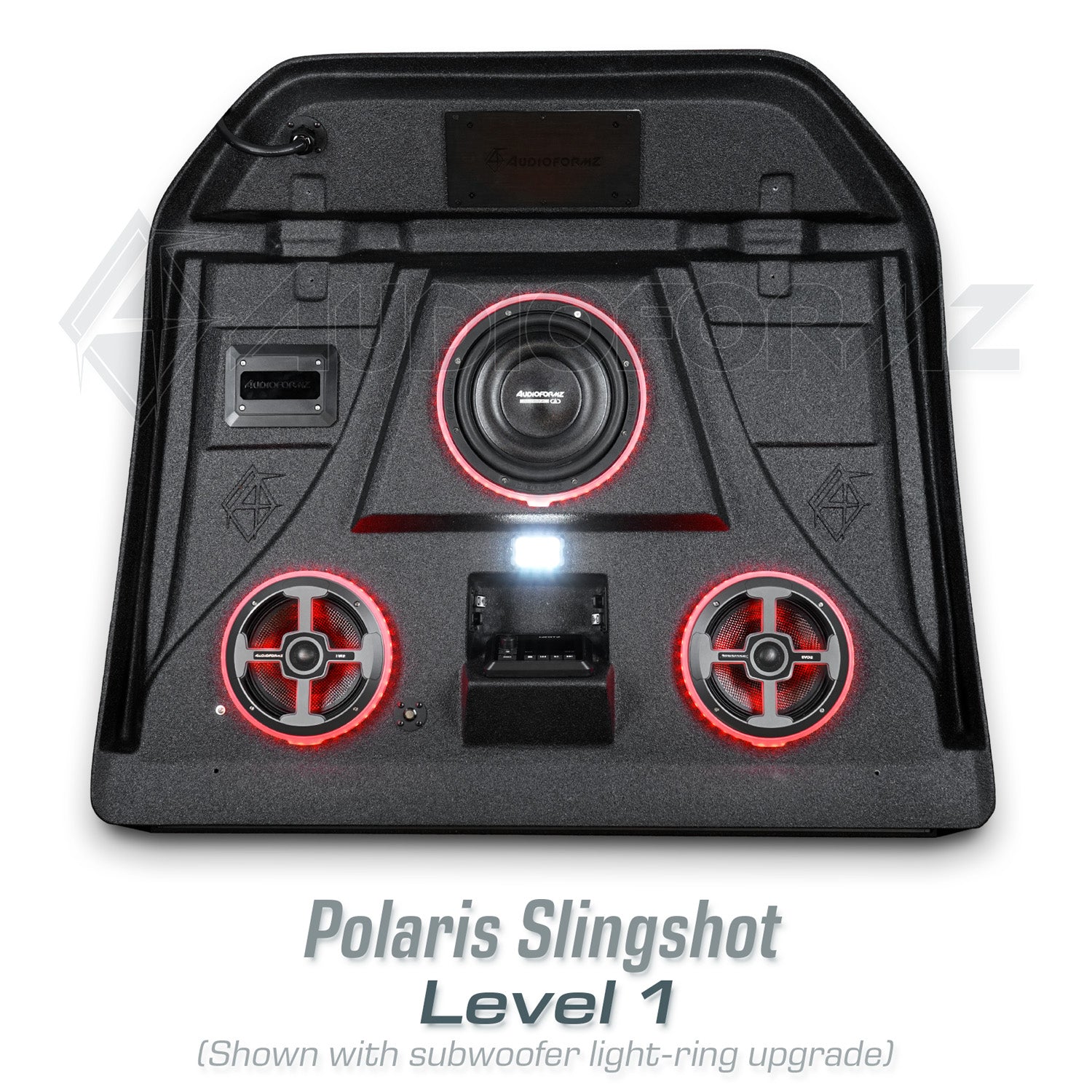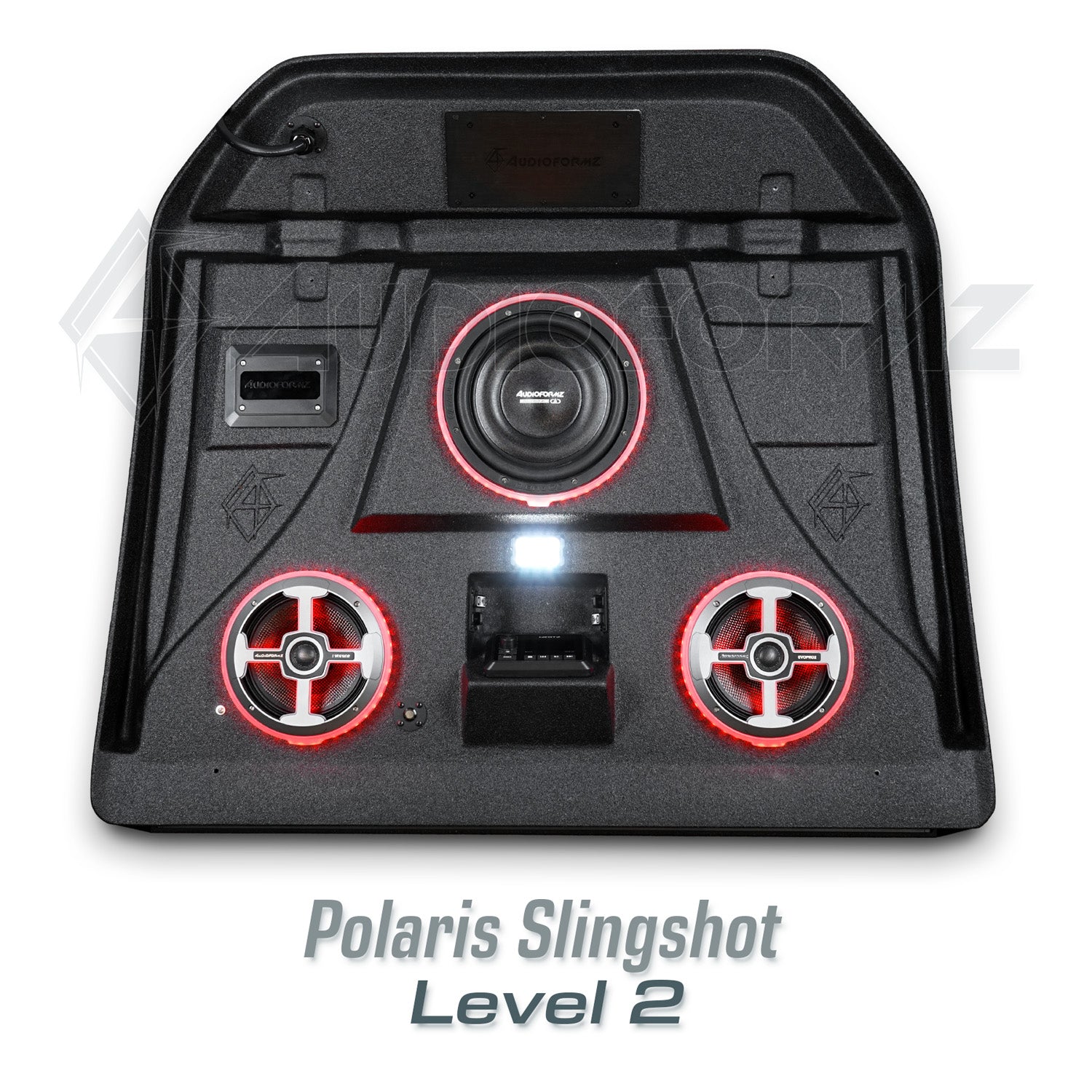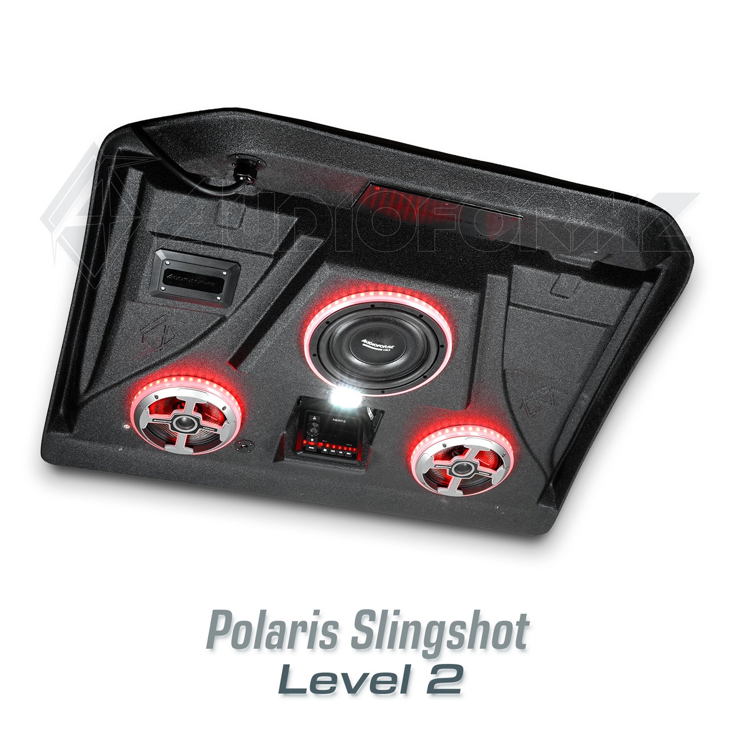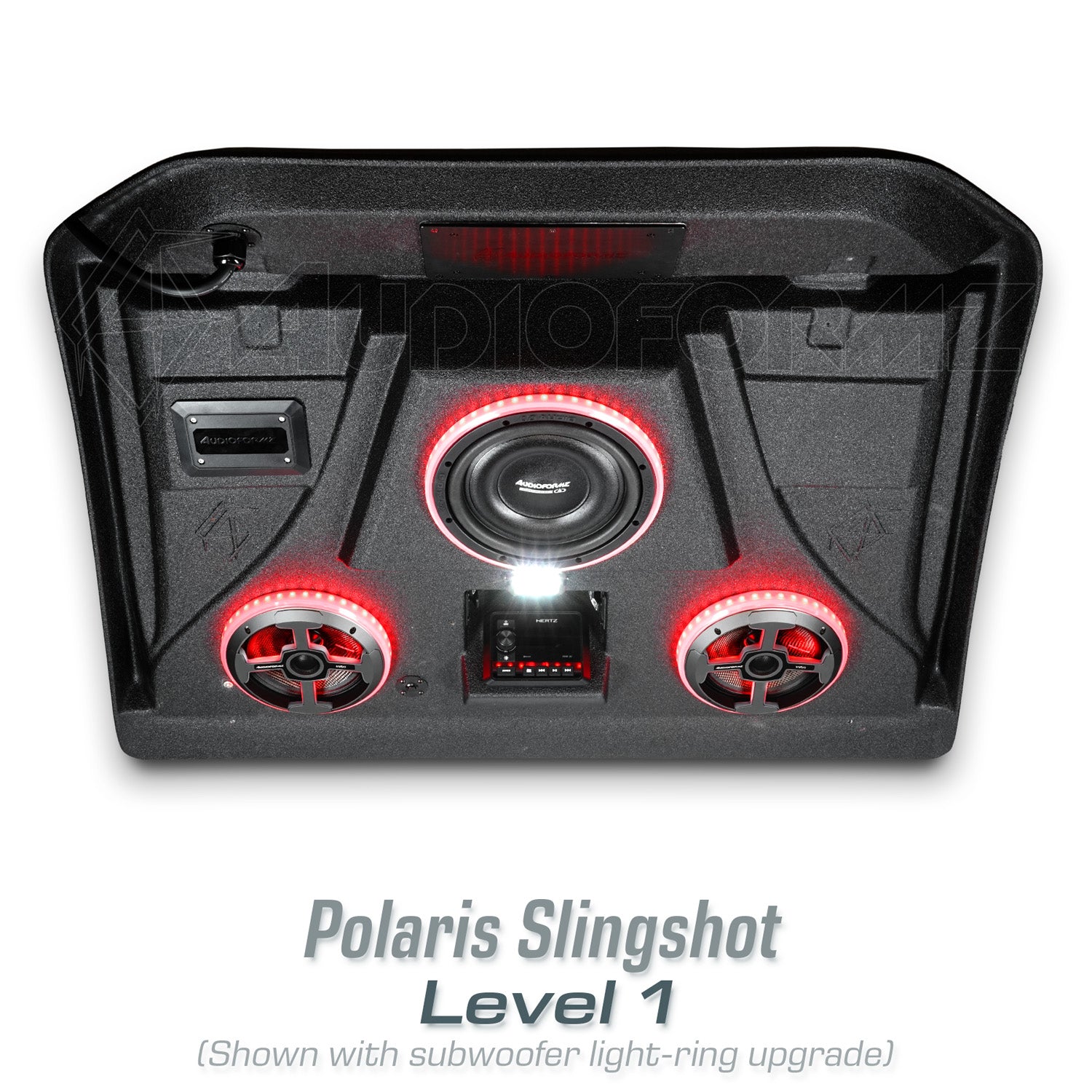 Built to fit Polaris Slingshot models equipped with the optional Polaris Excursion Top Frame OEM roll cage (as shown in photos), this all-new AudioFormz roof system brings killer looks, insane sound, and plug-and-play simplicity to your ride.